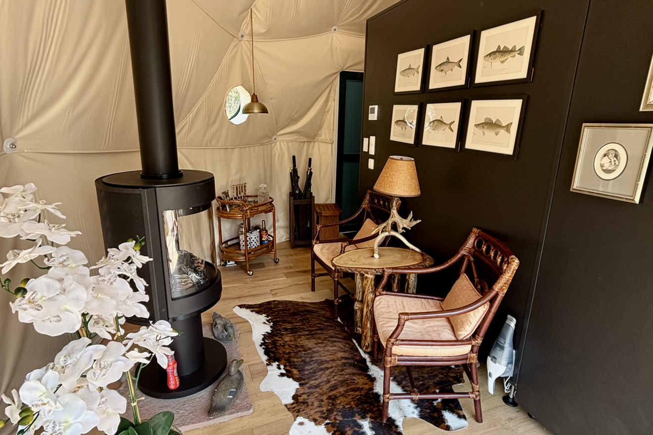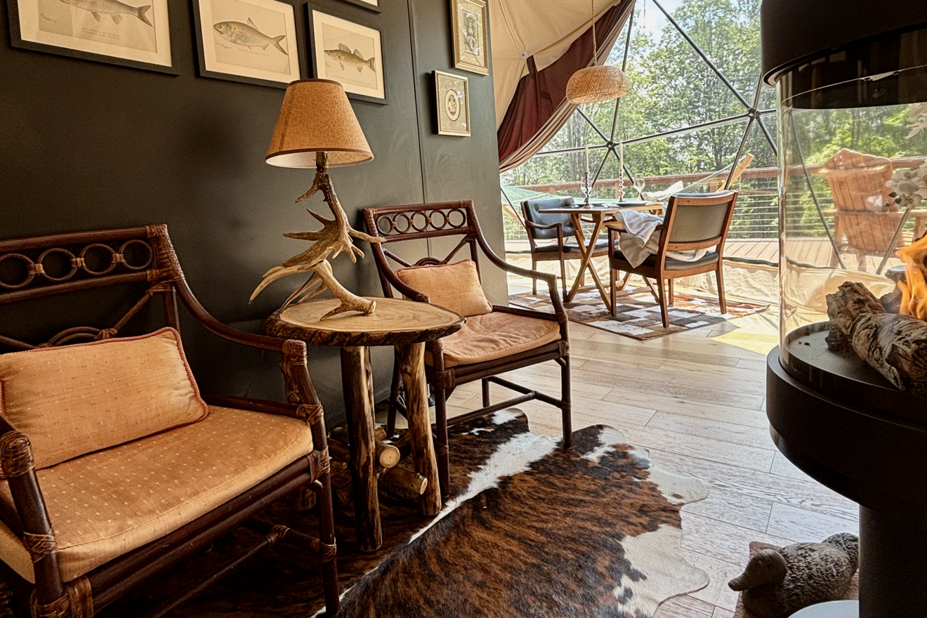 The Ambassador dome boasts amenities including a luxurious bathroom with shower, vegan bath products, cotton spa towels, queen bed with exquisite ironed linens, fully stocked galley kitchen with refrigerator, induction cooktop, espresso maker, and more. The dome features a dining area, gas indoor fireplace with club chair seating, and an additional reading nook. Outside use the wood-burning firepit, propane grill, table, or just relax on one of the deck lounge chairs.