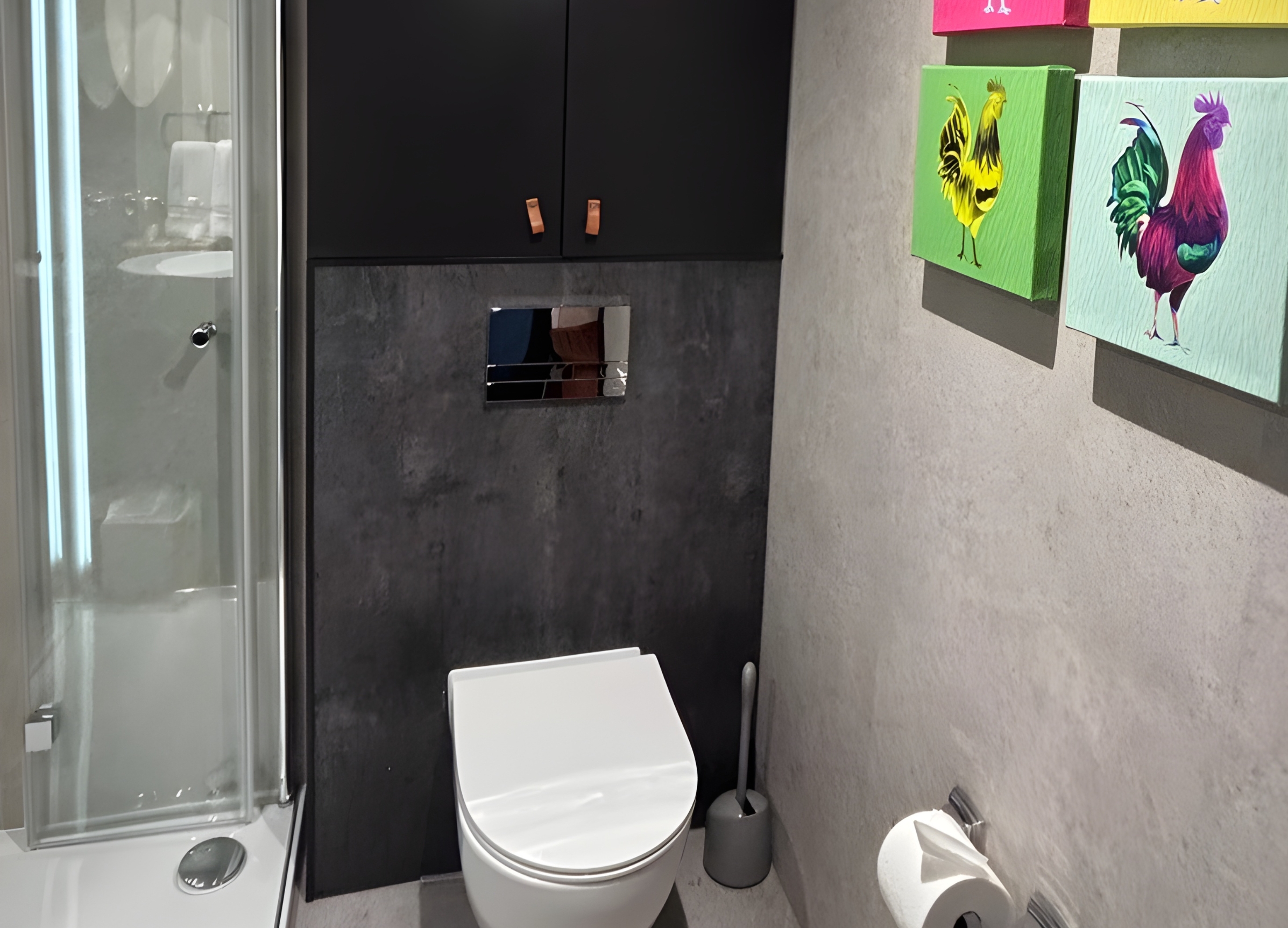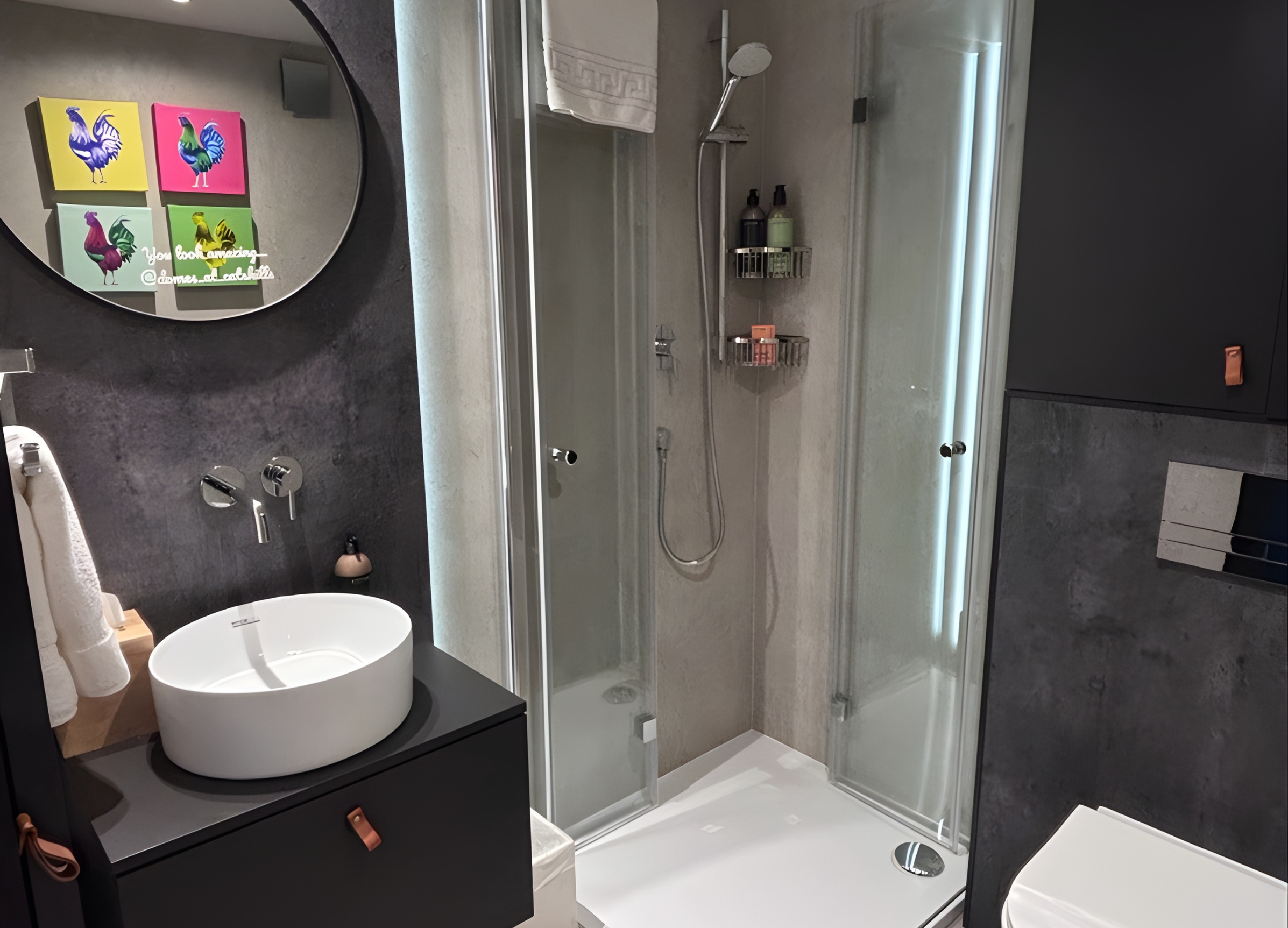 Luxurious bathroom with hot and cold running water and shower including vegan bath products, cotton spa towels and robes, slippers and hair dryer